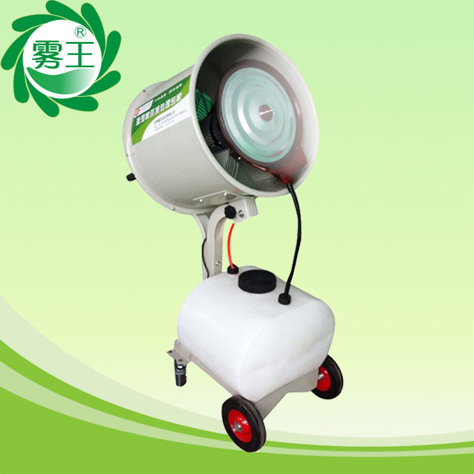 養殖專用手推加濕器采用離心式霧化技術,加濕量大且射程遠,可任意調節出霧量,霧化細微、均勻,可在不同季節使用冷熱水進行升降溫加濕,防堵塞、免維修、方便靈活操作自如, 接通電源即可開機,無需其它動力。離心式加濕器是利用高速電機帶動復合葉輪旋轉產生真空,貯水箱內的水在大氣壓力作用下通過吸水器壓至復合霧化葉輪,經化成 ф5um 的細霧 , 經過下進風道的微風 , 送至出霧口 , 在出霧口與上進風道的高速 風流相匯合 , 形成高速氣霧噴到空氣中,氣霧與空氣中的余熱相接觸 , 完全汽化,達到加濕的目的。