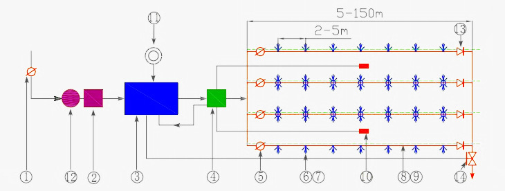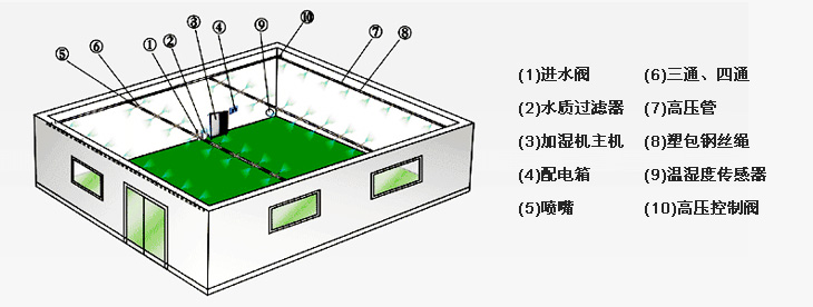 (1)進水閥 (2)水質過濾器 (3)加濕機主機 (4)電腦多路濕控器 (5)高壓控制閥(電動或手動) (6)噴嘴 (7)高壓三通、四通 (8)高壓管 (9)塑包鋼絲繩 (10)溫濕度傳感器 (11)冷水機組(選配) (12)離子軟水機 (13)高壓單向閥 (14)高壓電動閥排污系統